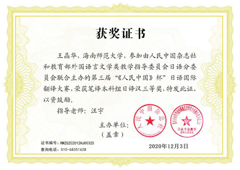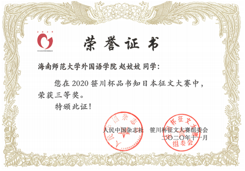2020年第三届“人民中国杯”日语国际翻译大赛和“笹川杯品书知日本征文大奖赛”获奖名单公布,我校日语系三名同学荣获佳绩。其中2017级王晶华同学获得翻译大赛本科日译汉组三等奖,2018级赵姣姣同学和2017级熊纤愉同学分获笹川杯征文大奖赛三等奖和优秀奖,日语系汪宇老师作为指导教师荣获“笹川杯优秀指导教师奖”。
