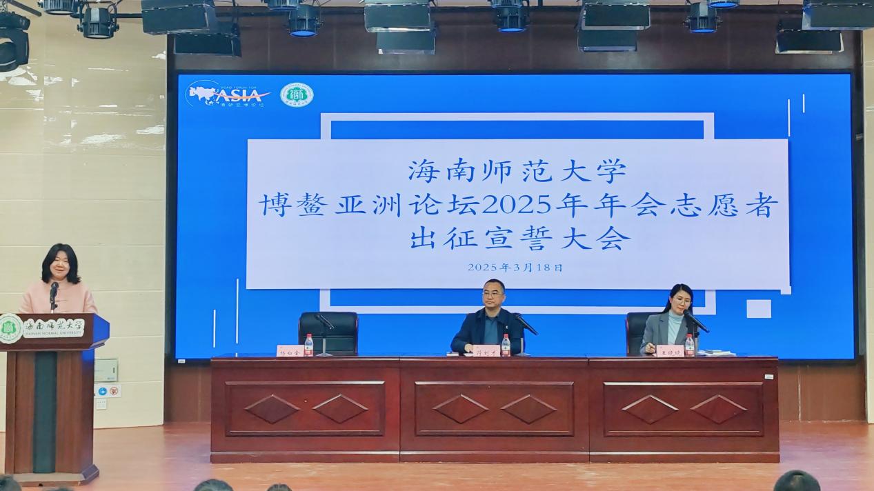为彰显海师学子的责任担当,讲好海师学子的博鳌故事,2025年3月18日下午,海南师范大学博鳌亚洲论坛2025年年会志愿者出征宣誓大会于海南师范大学(桂林洋校区)外语楼110报告厅隆重召开。出席本次大会的领导老师有校党委副书记符刘才老师、校团委书记王晓晓老师、校团委林智老师、外院团委书记张群燕老师,会议由海师外院党委副书记、博鳌亚洲论坛2025年年会志愿者工作组组长杨白全老师主持。