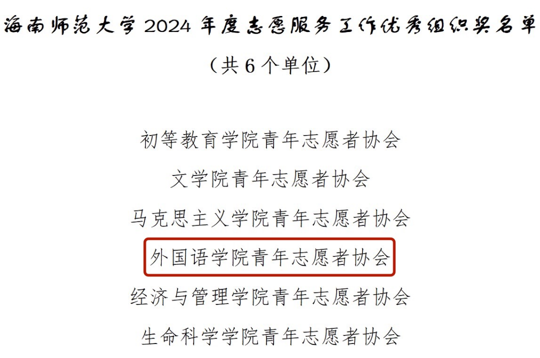 为深入学习贯彻习近平新时代中国特色社会主义思想和党的二十大精神,贯彻落实习近平总书记关于志愿服务的重要论述和系列重要指示批示精神,发挥先进典型的示范引领作用,营造人人崇尚志愿服务、参与志愿服务的浓厚氛围,激励更多的团员青年投身志愿服务活动,校团委开展了海南师范大学2024年度志愿服务工作优秀个人奖、组织奖评选表彰活动。在本次评选中,外国语学院荣获多项集体与个人荣誉,接下来让我们一睹外国语学院获奖风采吧!