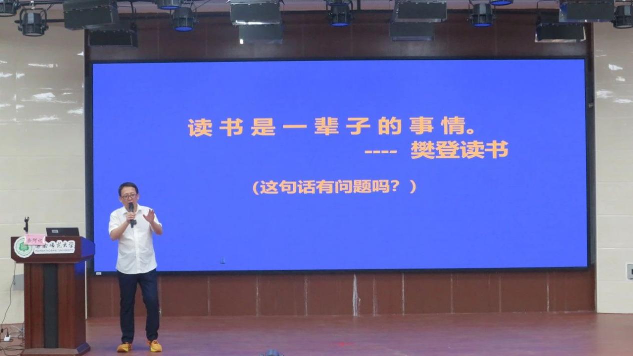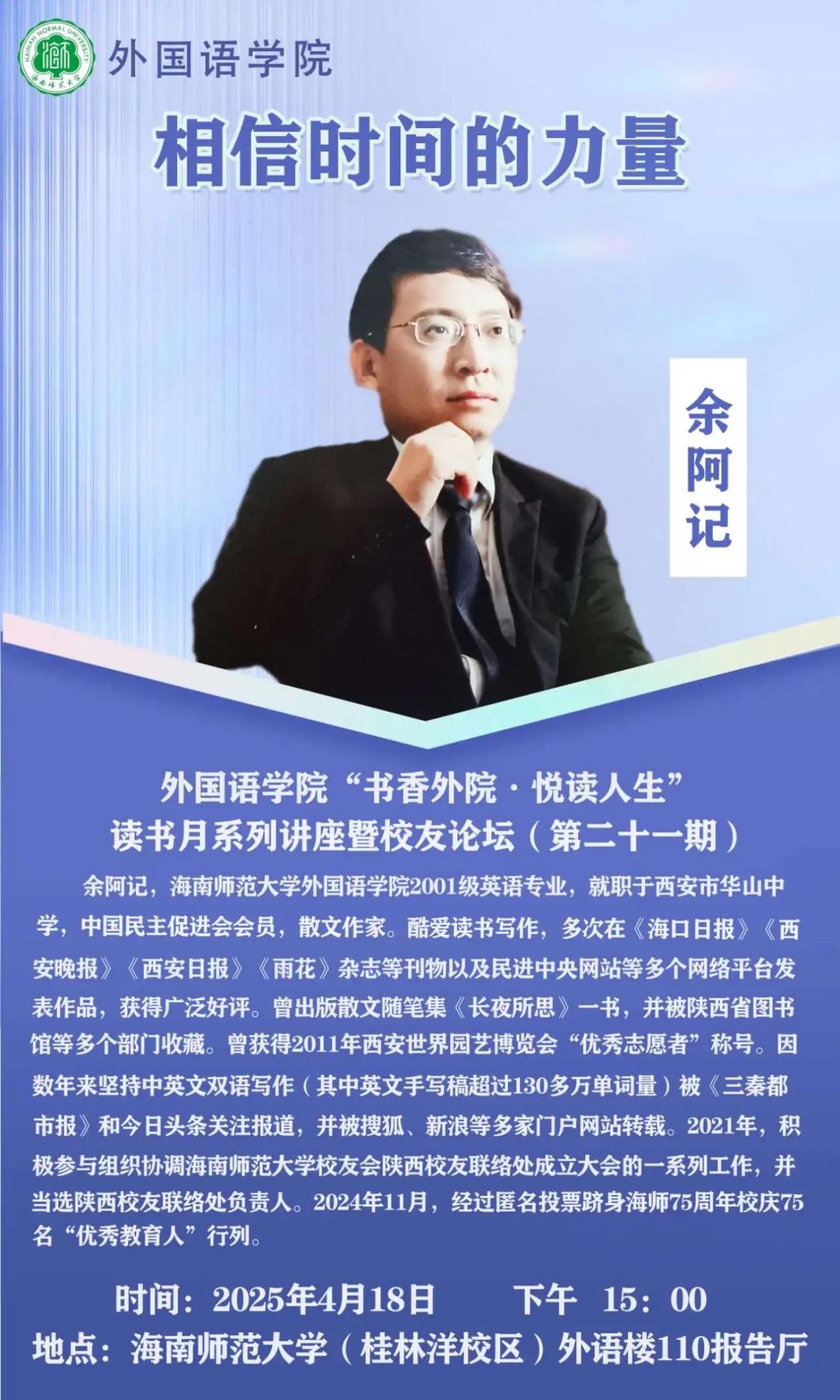 为迎接第30个“4.23世界读书日”,激发外国语学院学生的阅读兴趣,营造浓厚的阅读氛围。2025年4月18日15时,外国语学院邀请余阿记校友于外语楼110报告厅开展“相信时间的力量”专题讲座,此次讲座是外国语学院“书香外院·悦读人生”读书月系列活动暨第二十一期校友论坛,讲座由学院副院长蔡激浪主持。