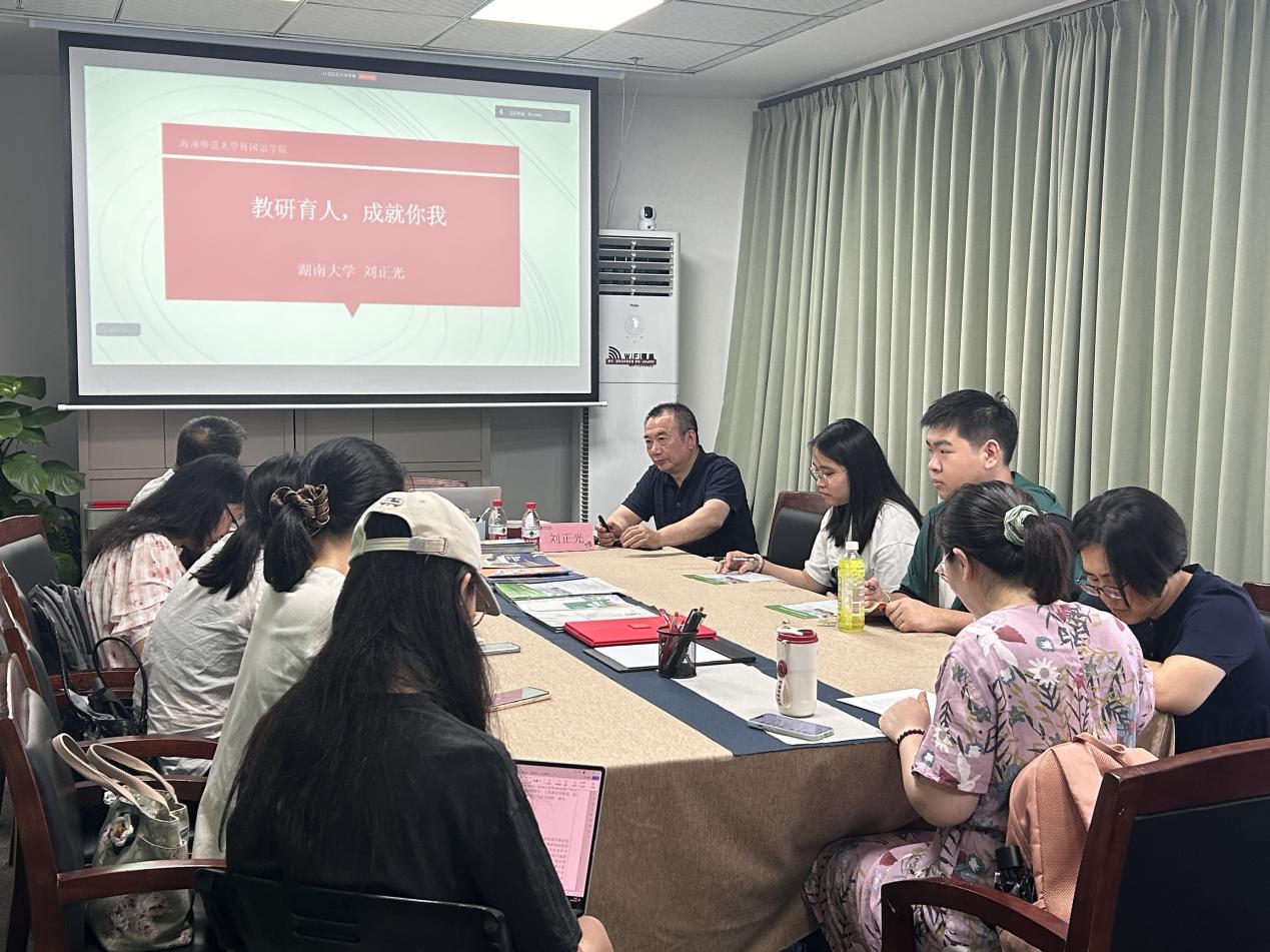 海南师范大学外国语学院诚邀湖南大学刘正光教授来我院进行相关学术交流与咨询活动,2025年4月25日下午,在实验楼二楼案例分析室为我院师生开展题为“教研育人,成就你我”的学术交流分享会。本次座谈由外国语学院副院长李雯主持,外国语学院副院长李孟端及部分教师、研究生共同参与。