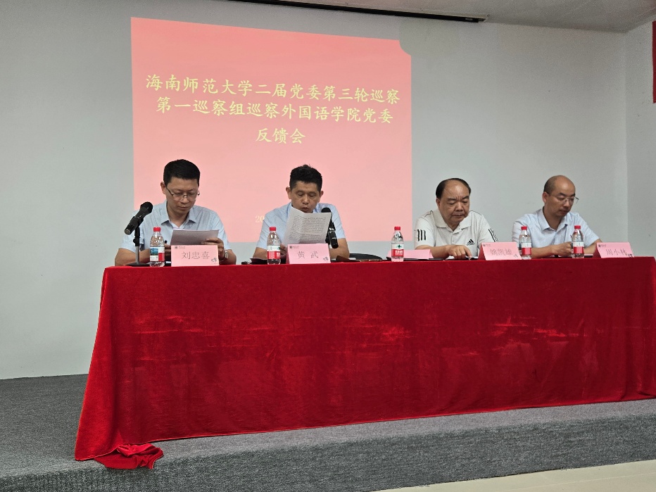 2025年5月20日下午,在龙昆南校区外国语学院会议室召开海南师范大学二届党委第三轮巡察第一巡察组巡察外国语学院党委反馈会。校纪检、组织部、巡察办相关负责人,巡察组组长黄武、副组长蒋瑜、王国英及其成员,学院党政班子成员、科级干部、教师代表参会。会议由外国语学院副院长刘忠喜同志主持。