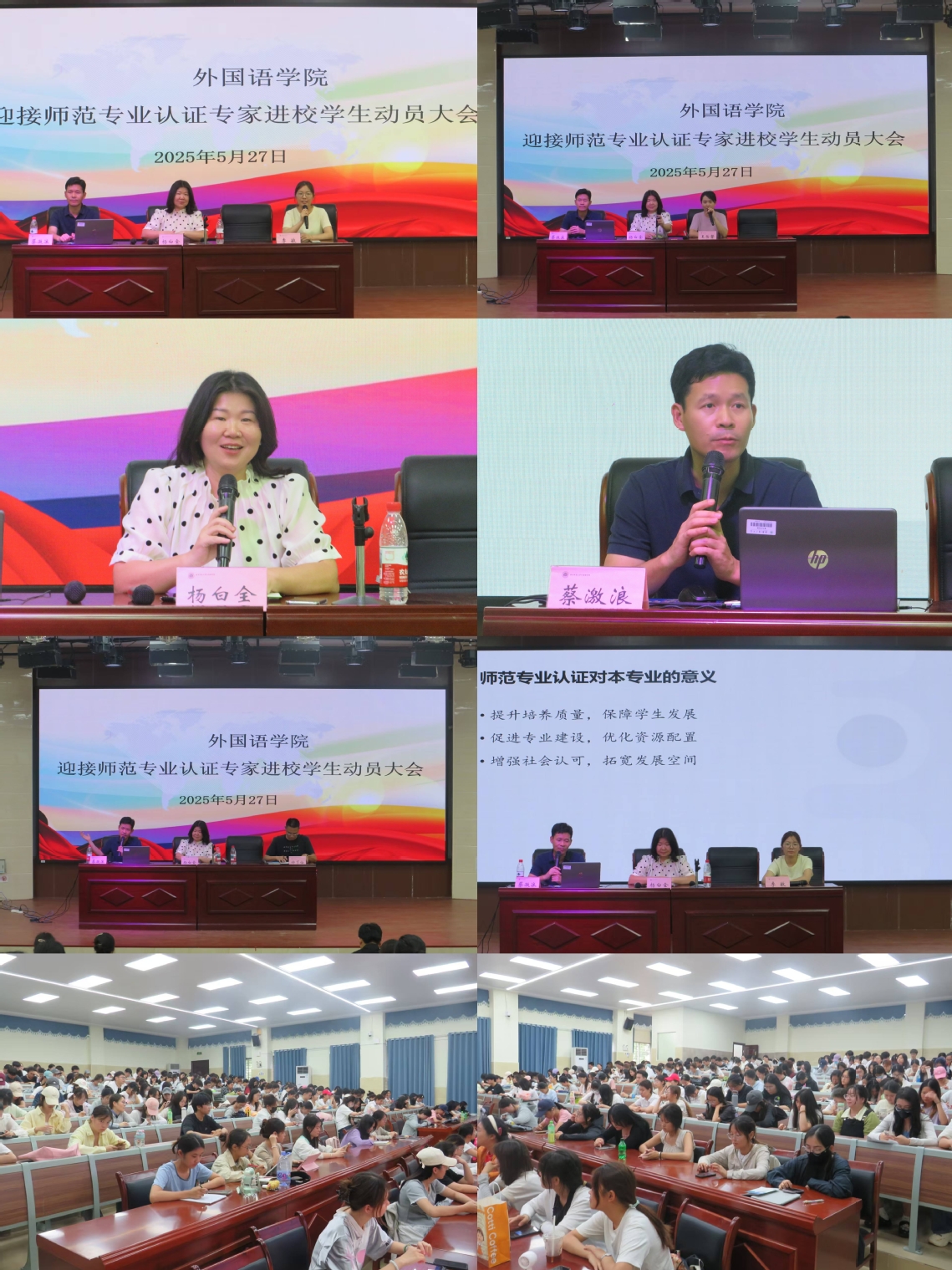 为迎接2025年英语(师范)专业认证专家进校考查,5月27日,海南师范大学外国语学院于外语楼110报告厅分批召开学生动员大会。出席本次大会的有外国语学院党委副书记杨白全、副院长蔡激浪及各年级辅导员。外国语学院22级、23级、24级全体本科生分批参会。