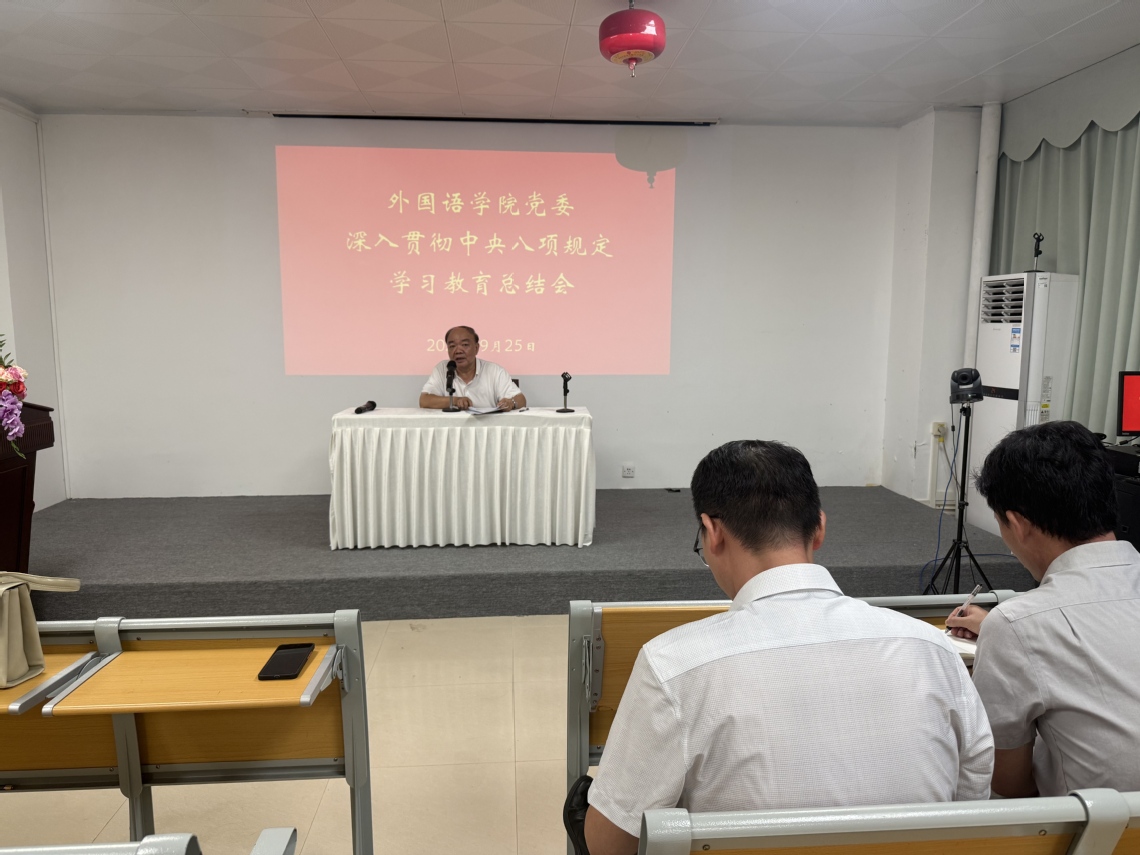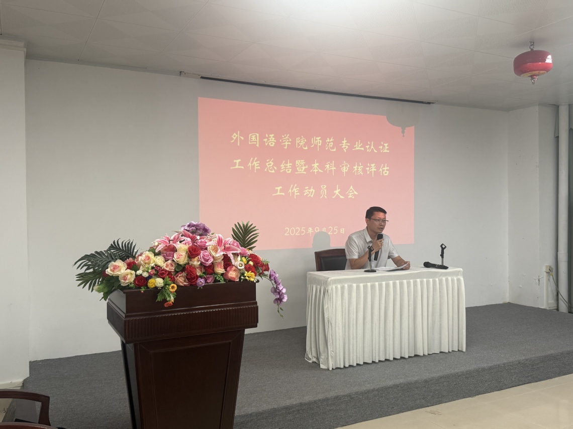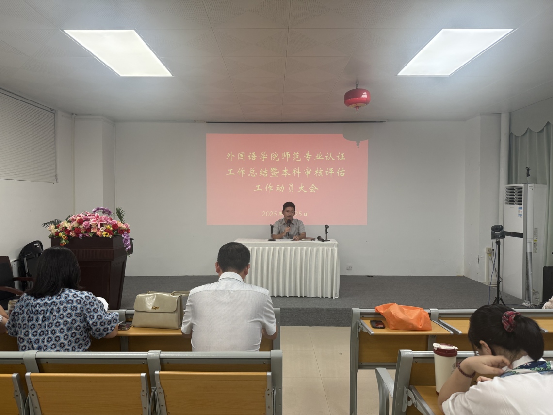 2025年9月25日下午三点,为全面总结师范专业认证工作经验,迎接本科审核评估工作,外国语学院在实验二楼案例研讨室召开师范专业认证工作总结会暨本科审核评估工作动员大会。学院全体教职工参加会议。本次会议由刘忠喜院长主持。会议分为四项议程。