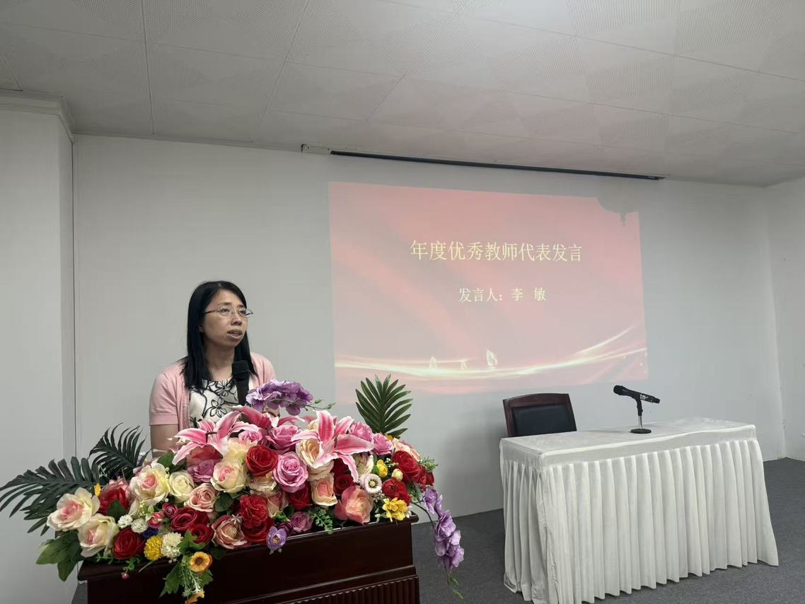 李敏老师作为“年度优秀教师”代表发言。她回顾了自己在学院十九年的工作历程,表达了对学院的感恩之情。她表示,十九年来,自己始终不忘初心,关注学生的成长,还始终铭记育人先育己,坚持不断提升自我。