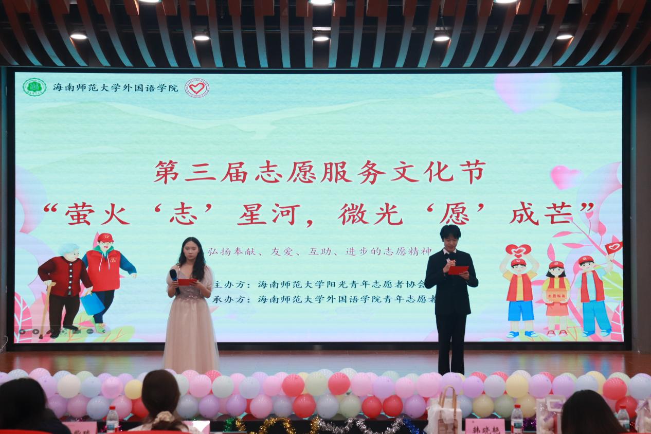 为深入学习宣传习近平新时代中国特色社会主义思想和党的二十大精神,贯彻落实习近平总书记对学雷锋活动的重要指示精神,鼓励同学们积极投身志愿服务活动,弘扬奉献、友爱、互助、进步的志愿精神,展现青年志愿先锋风采。2025年5月24日19时,海南师范大学外国语学院第三届“萤火‘志’星河,微光‘愿’成芒”志愿服务文化节于桂林洋图书馆一楼报告厅圆满举办。