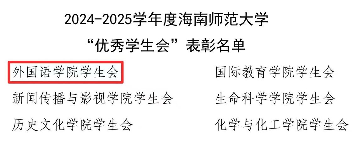 为表彰先进、树立典型,依据《关于开展海南师范大学2024-2025学年度“优秀学生会”“特色学生会”“优秀学生会干部”评选活动的通知》,经评审决定,我院学生会荣获海南师范大学2024-2025学年度“优秀学生会”,我院多名学子荣获“优秀学生会干部”荣誉称号。