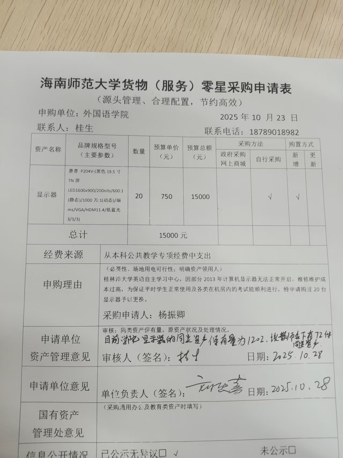 海南师范大学外国语学院为学院采购设备,根据学校相关规定,对预采购设备进行公示,公示期为三天,如有疑义请拨打电话0898-65883218